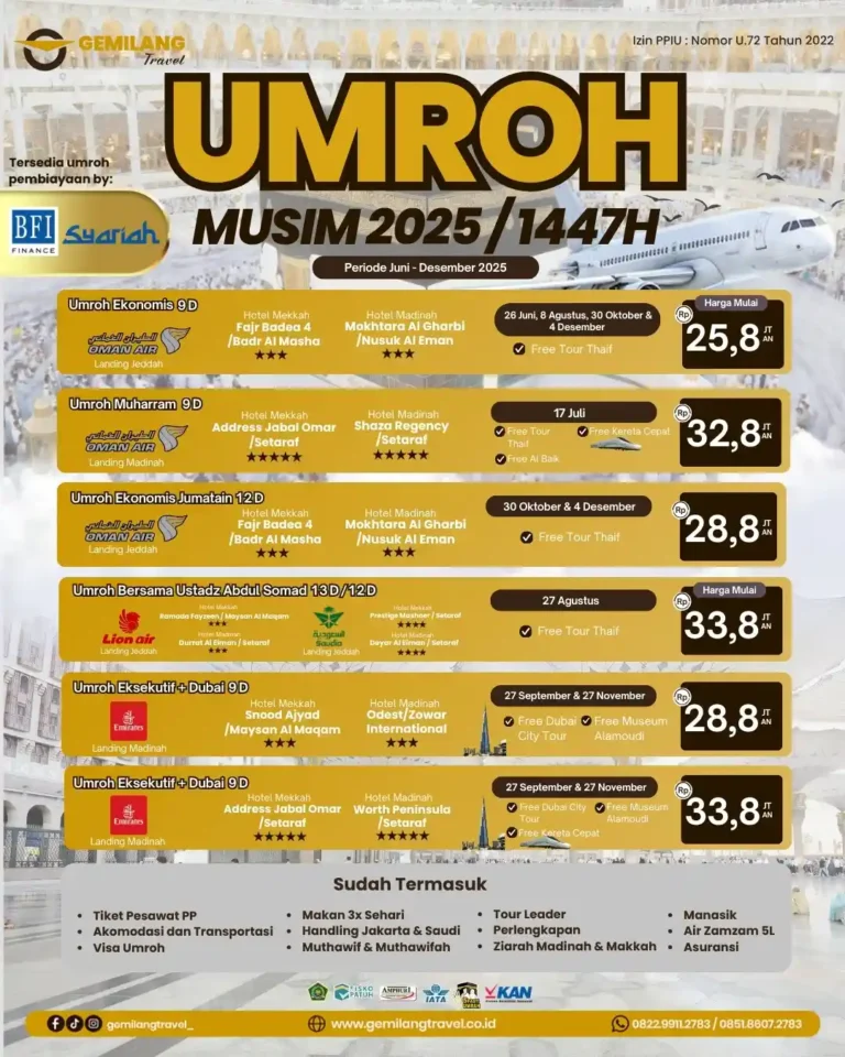 Gemilang Travel telah terdaftar secara resmi di Kemenag RI dengan nomor registrasi PPIU U72 2022.